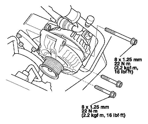 1. Install the alternator, then connect the alternator connector (A) and positive alternator cable (B) and install the harness clamp (C). Make sure the crimped side of the ring terminal faces away from the alternator when you connect it.
