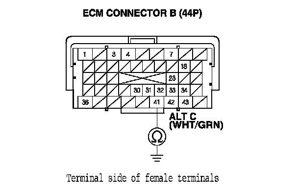 13. Check for loose terminal and connectors, then check for continuity between ECM connector terminal B41 and alternator 4P connector terminal No. 2.