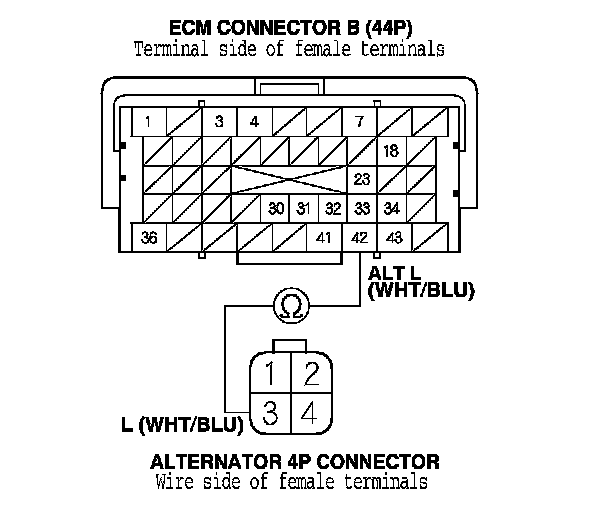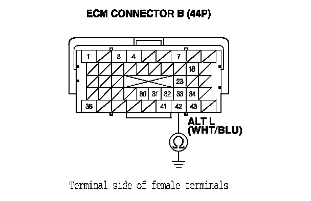 25. Check for continuity between ECM connector terminal B42 and alternator 4P connector terminal No. 3.