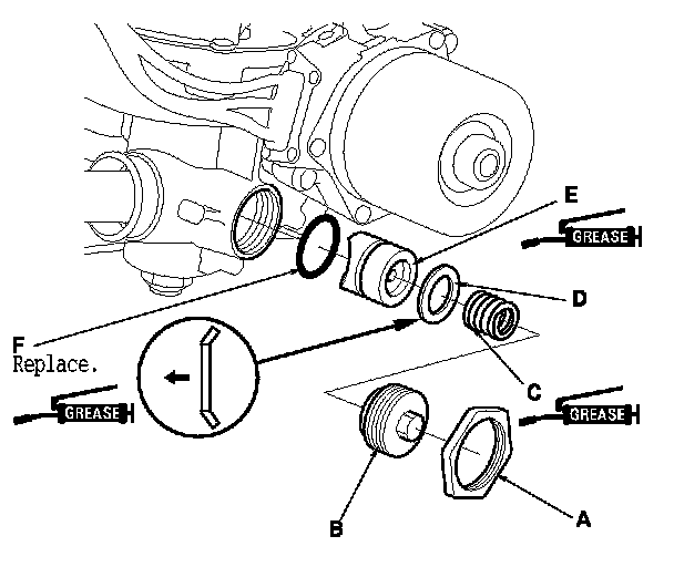 3. Remove the O-ring (F) from the rack guide. Wipe the grease off the sliding surface of the rack guide.