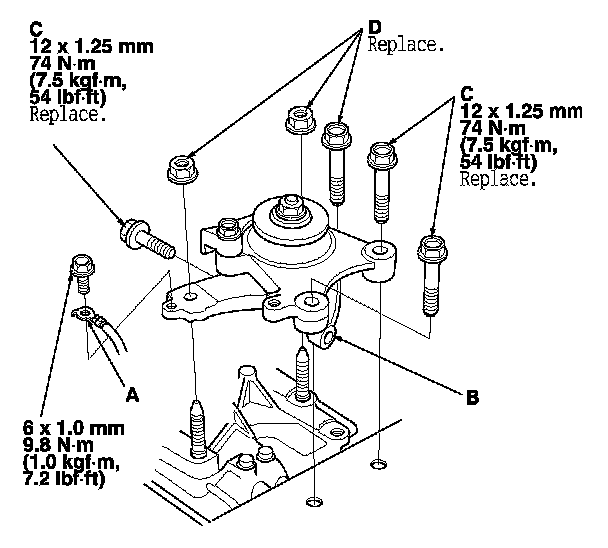 13. Install the transmission mount, and tighten the new transmission mount mounting bolts (C).
