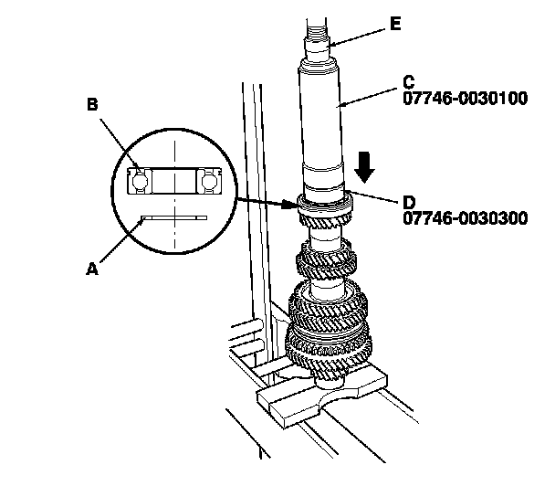 14. Install the 35 mm shim (A), and temporary press on the old ball bearing (B) using the 40 mm inner driver handle (C), the 30 mm inner bearing driver attachment (D), and a press (E).