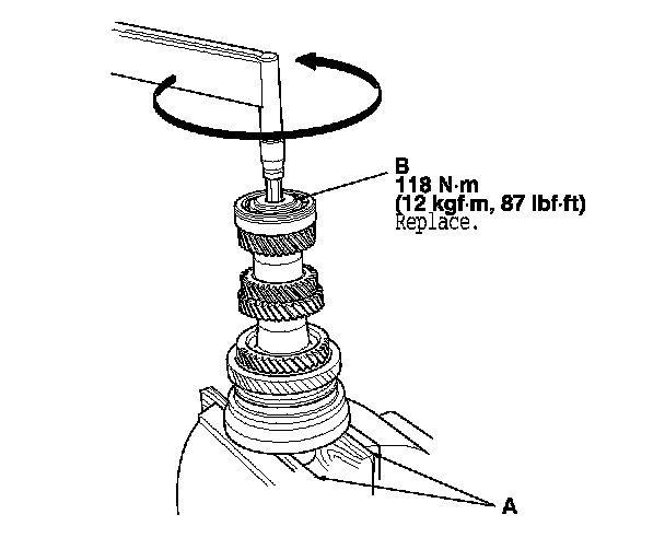 20. Securely clamp the countershaft assembly in a bench vise with wood blocks (A).