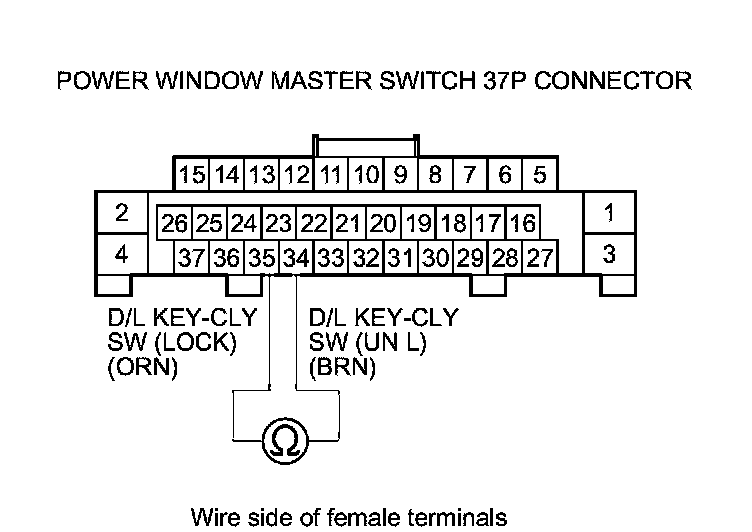 15. Check for continuity between power window master switch 37P connector terminals No. 34 and No. 35.