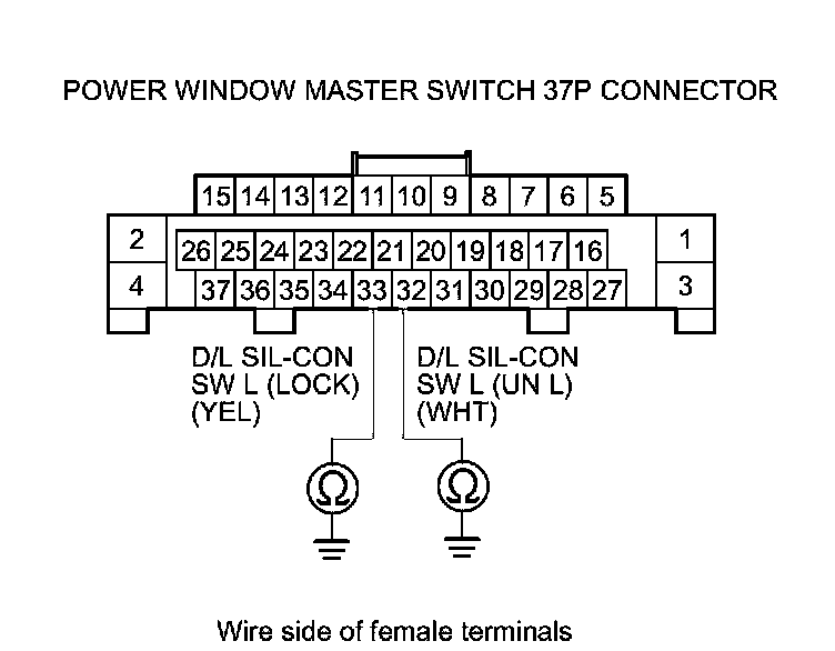 11. Check for continuity between body ground and power window master switch 37P connector terminals No. 32 and No. 33 individually.