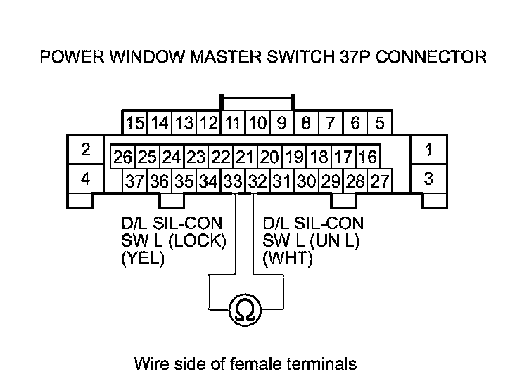 14. Check for continuity between power window master switch 37P connector terminals No. 32 and No. 33.