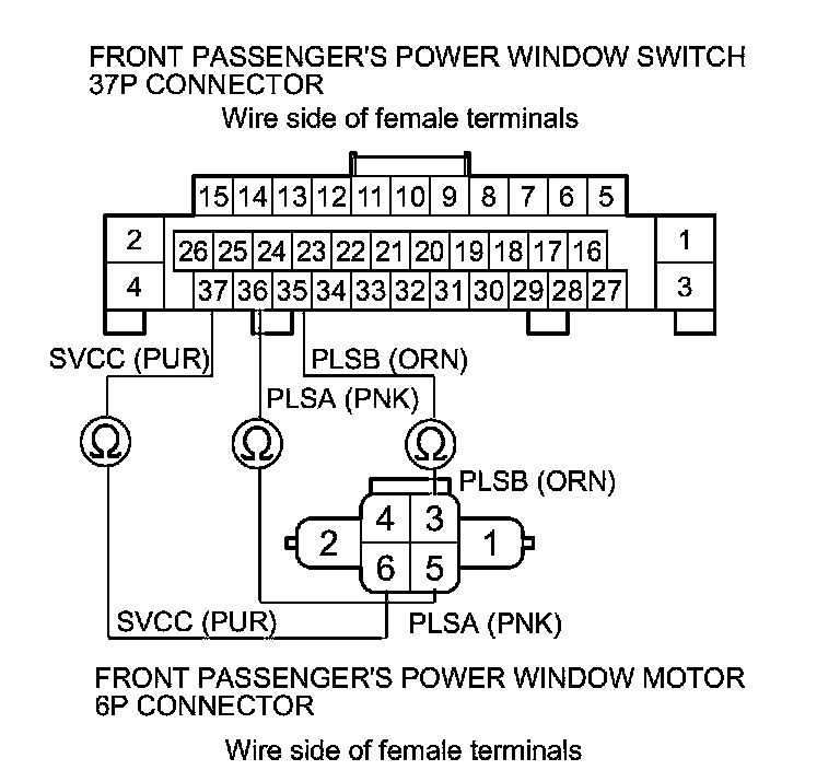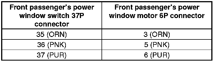 8. Check for continuity between the front passenger's power window switch 37P connector terminals and front passenger's power window motor 6P connector terminals as shown: