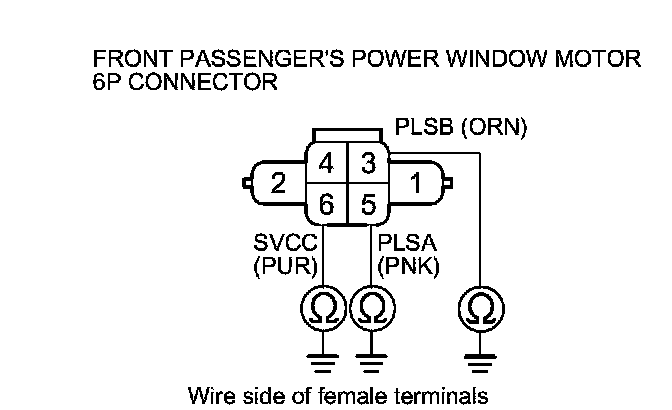 9. Check for continuity between front passenger's power window motor 6P connector terminals No. 3, No. 5, and No.6 and body ground individually.