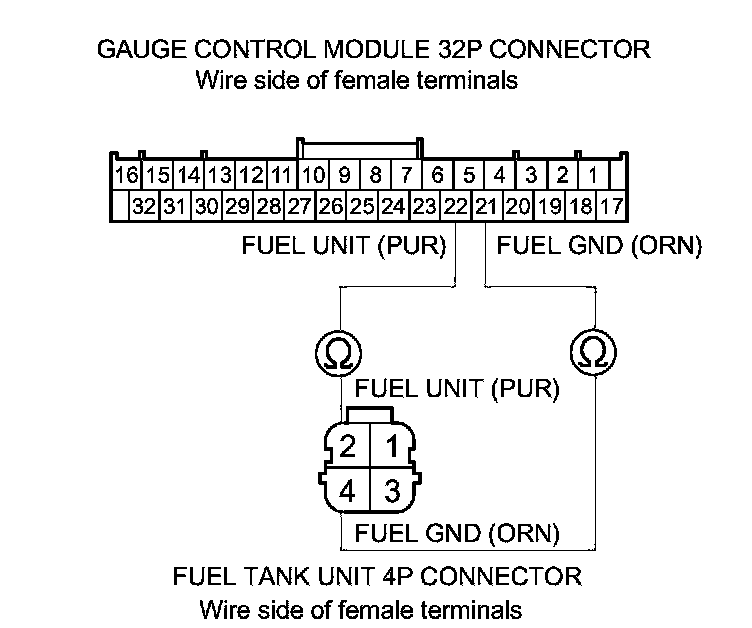 8. Check for continuity between gauge control module 32P connector terminals No. 21 and No. 22 and fuel tank unit 4P connector terminals No. 4 and No. 2 respectively.