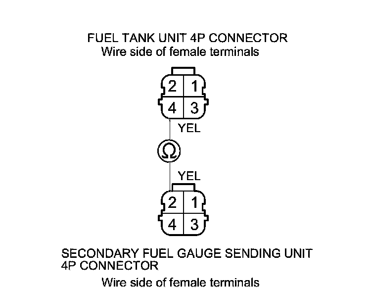 11. Check for continuity between fuel tank unit 4P connector terminal No. 4 and secondary fuel gauge sending unit 4P connector terminal No. 2.