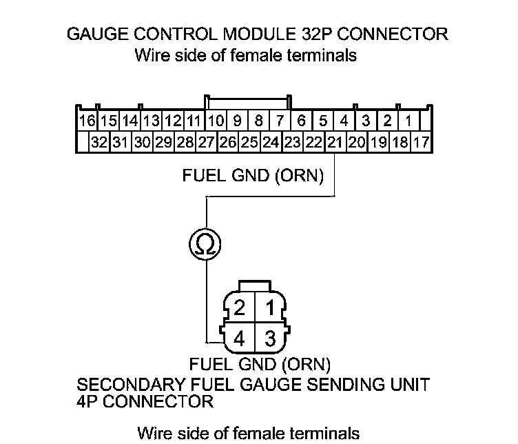 13. Check for continuity between gauge control module 32P connector terminal No. 21 and secondary fuel gauge sending unit 4P connector terminal No. 4.