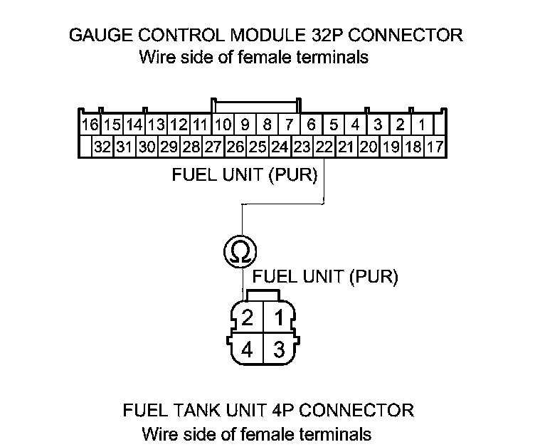 14. Check for continuity between gauge control module 32P connector terminal No. 22 and fuel tank unit 4P connector terminal No. 2.