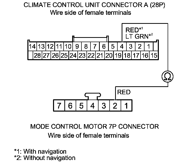 9. Check for continuity between the following terminals of climate control unit connectors A (28P), B (12P), and the mode control motor 7P connector.
