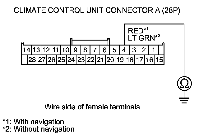 10. Check for continuity between climate control unit connector A (28P) terminal No. 4 and body ground.