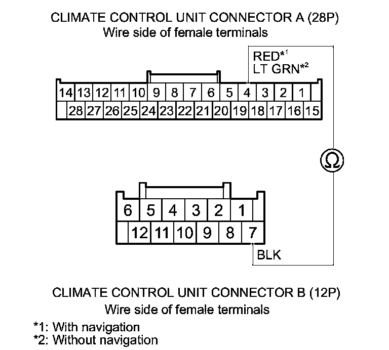 11. Check for continuity between climate control unit connector A (28P) terminal No. 4 and climate control unit connector B (12P) terminal No. 7.