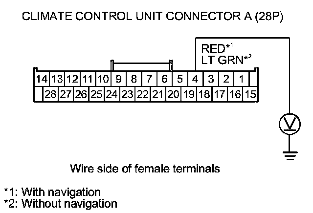 12. Turn the ignition switch to ON (II), and measure the voltage between climate control unit connector A (28P) terminal No. 4 and body ground.
