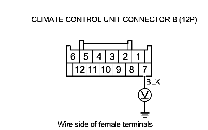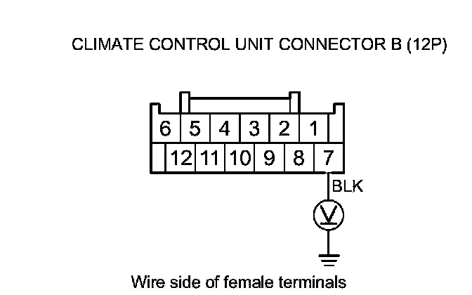 16. Turn the ignition switch to ON (II), and measure the voltage between climate control unit connector B (12P) terminal No. 7 and body ground.