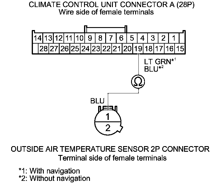 8. Check for continuity between climate control unit connector A (28P) terminal No. 19 and outside air temperature sensor 2P connector terminal No. 1.