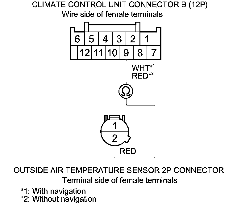 9. Check for continuity between climate control unit connector B (12P) terminal No. 9 and outside air temperature sensor 2P connector terminal No. 2.
