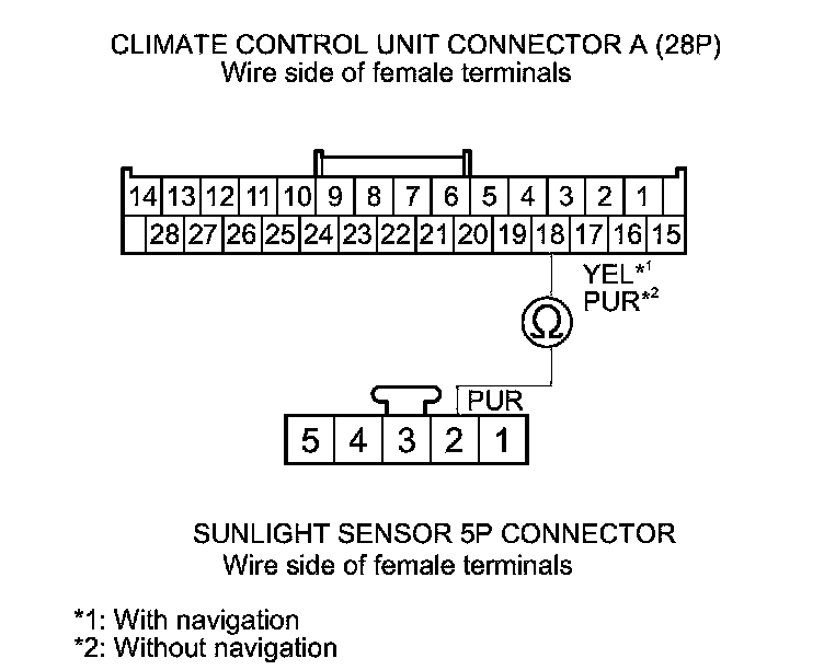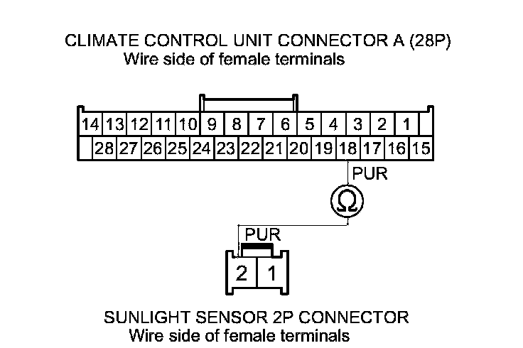 8. Check for continuity between climate control unit connector A (28P) terminal No. 18 and sunlight sensor 5P connector terminal No. 2 (with automatic lighting), or sunlight sensor 2P connector terminal No. 2 (without automatic lighting).