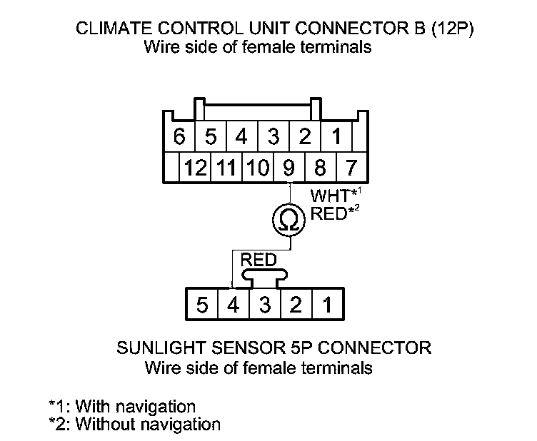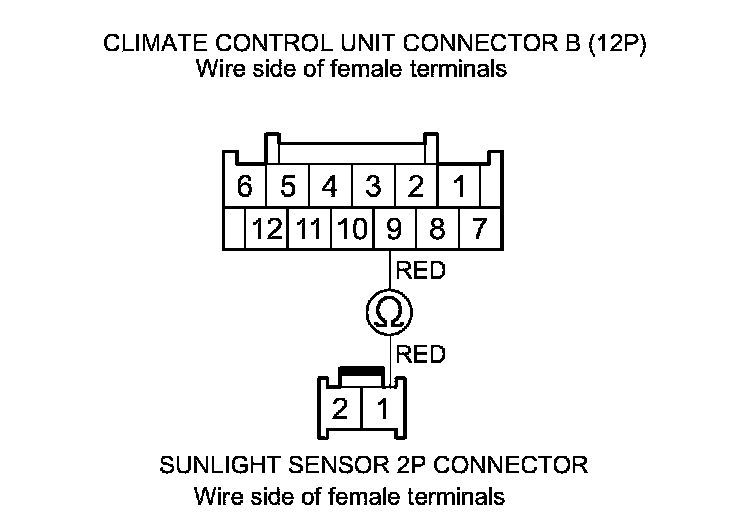 9. Check for continuity between climate control unit connector B (12P) terminal No. 9 and sunlight sensor 5P connector terminal No. 4 (with automatic lighting), or sunlight sensor 2P connector terminal No. 1 (without automatic lighting).