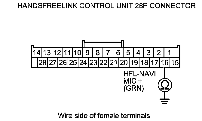 10. Check for continuity between HandsFreeLink control unit 28P connector terminal No. 16 and body ground.