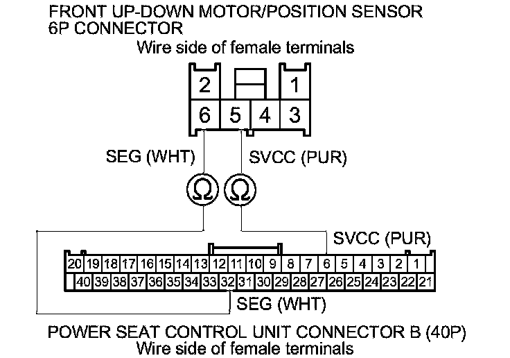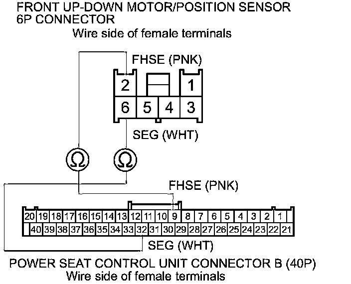 20. Check for continuity between power seat control unit connector B (40P) terminals No. 6 and No. 32 and front up-down motor/position sensor 6P connector terminals No. 5 and No. 6 respectively.