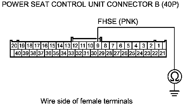 13. Check for continuity between body ground and power seat control unit connector B (40P) terminal No. 9.