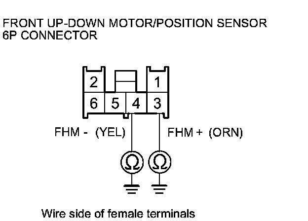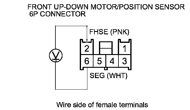 16. Measure the voltage between front up-down motor/position sensor 6P connector terminals No. 2 (+) and No. 6 (-).