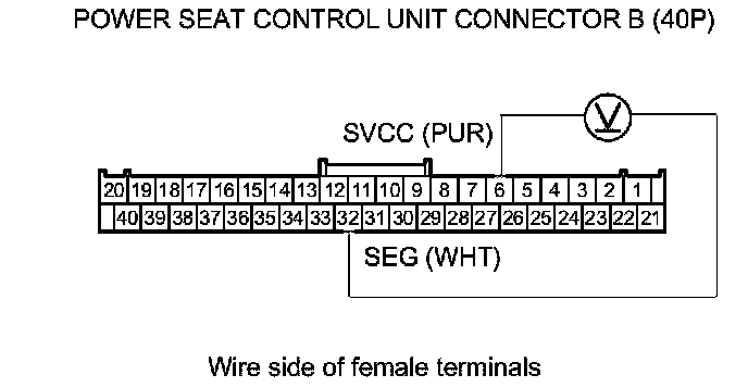 23. Measure the voltage between power seat control unit connector B (40P) terminals No. 6 and No. 32.