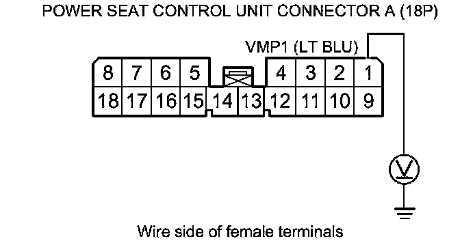 27. Measure the voltage to body ground between body ground and power seat control unit connector A (18P)terminals No. 1.