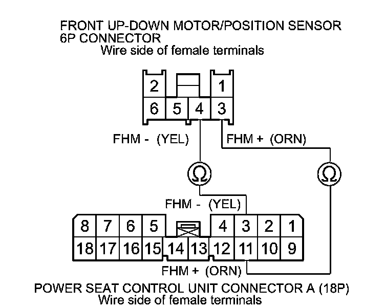 32. Check for continuity between power seat control unit connector A (18P) terminals No. 11 and No. 3 and front up-down motor/position sensor 6P connector terminals No. 3 and No. 4 respectively.