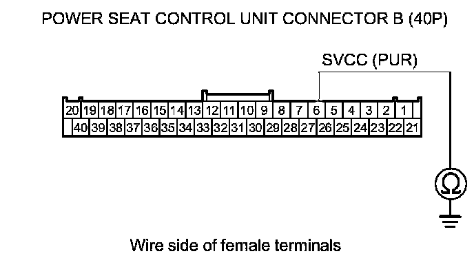 8. Check for continuity between power seat control unit connector B (40P) terminal No. 6 and body ground.