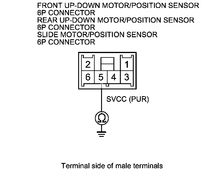 9. Check for continuity between body ground (motor body) and terminal No. 5 of the front up-down motor/position sensor, rear up-down motor/position sensor, and slide motor/position sensor.