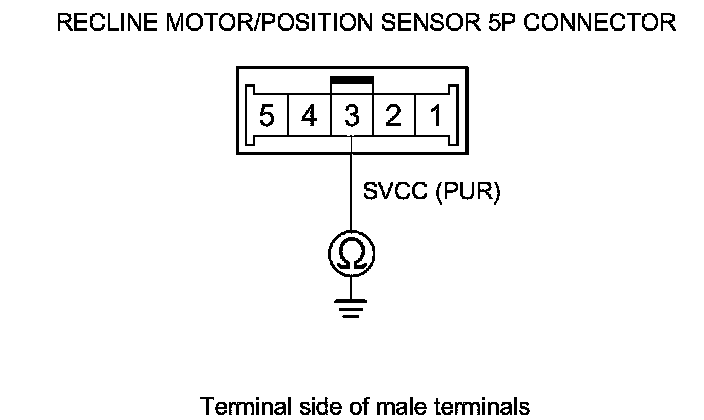 10. Check for continuity between body ground (seat frame) and recline motor/position sensor 5P connector terminal No.3.