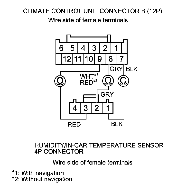 Check for loose wires or poor connections at climate control unit connector B (12P) and at the humidity/in-car temperature sensor 4P connector. If the connections are good, substitute a known-good climate control unit, and recheck. If the symptom/indication goes away, replace the original climate control unit; with navigation Climate Control Unit Removal/Installation (With Navigation), without navigation Climate Control Unit Removal/Installation (Without Navigation).�