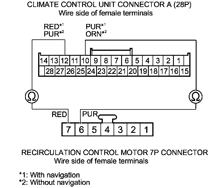 9. Check for continuity between the following terminals of climate control unit connector A (28P) and the recirculation control motor 7P connector.