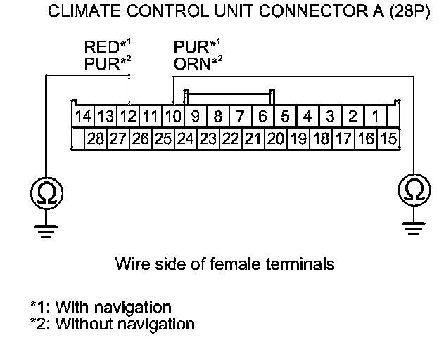 10. Check for continuity between body ground and climate control unit connector A (28P) terminals No. 10 and No. 12 individually.