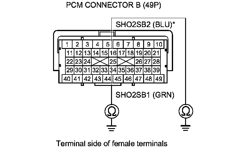 21. Check for continuity between PCM connector terminal B25 (B16)* and body ground.