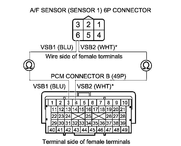 9. Check for continuity between A/F sensor (Sensor 1) 6P connector terminal No. 6 and PCM connector terminal B13 (B14)*.