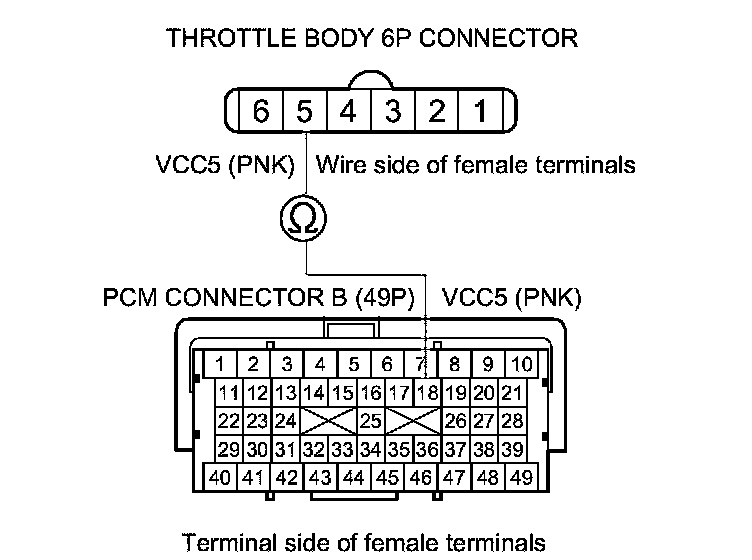15. Check for continuity between PCM connector terminal B18 and throttle body 6P connector terminal No. 5.