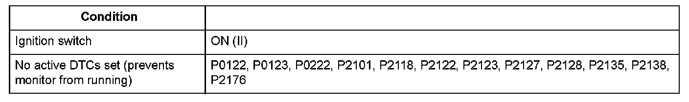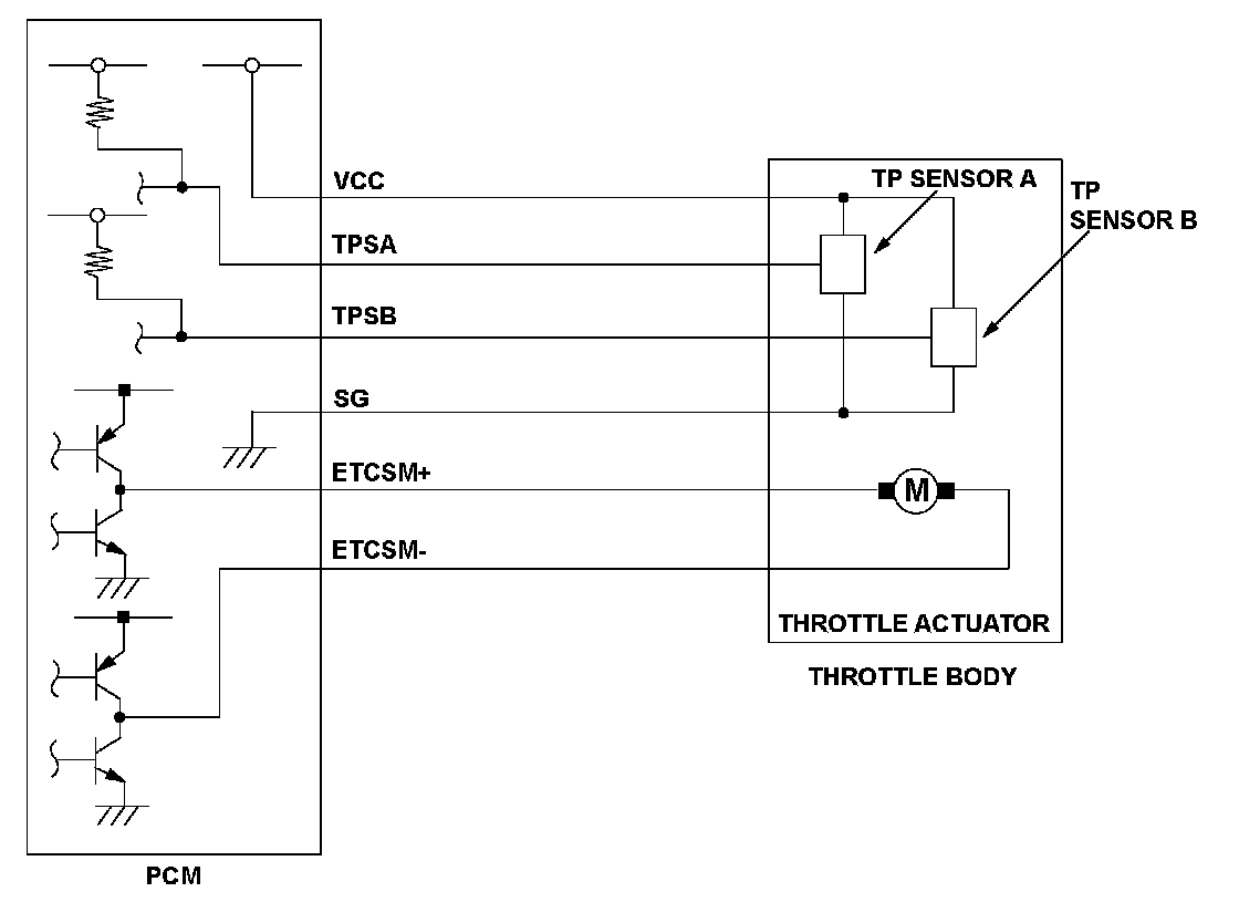 The electronic throttle control system controls the throttle valve opening. The system includes the throttle actuator, the throttle valve, throttle position (TP) sensors A and B, the electronic throttle control system (ETCS) control relay, the accelerator pedal position (APP) sensor, and the powertrain control module (PCM). TP sensor B is a semiconductor type, and it is attached to the throttle body and shaft to determine throttle valve position. The throttle valve position signal from TP sensor B is transmitted to the PCM for target position feedback control. If the signal from TP sensor B is a fixed value for a set time, the PCM detects a TP sensor B malfunction and stores a DTC.