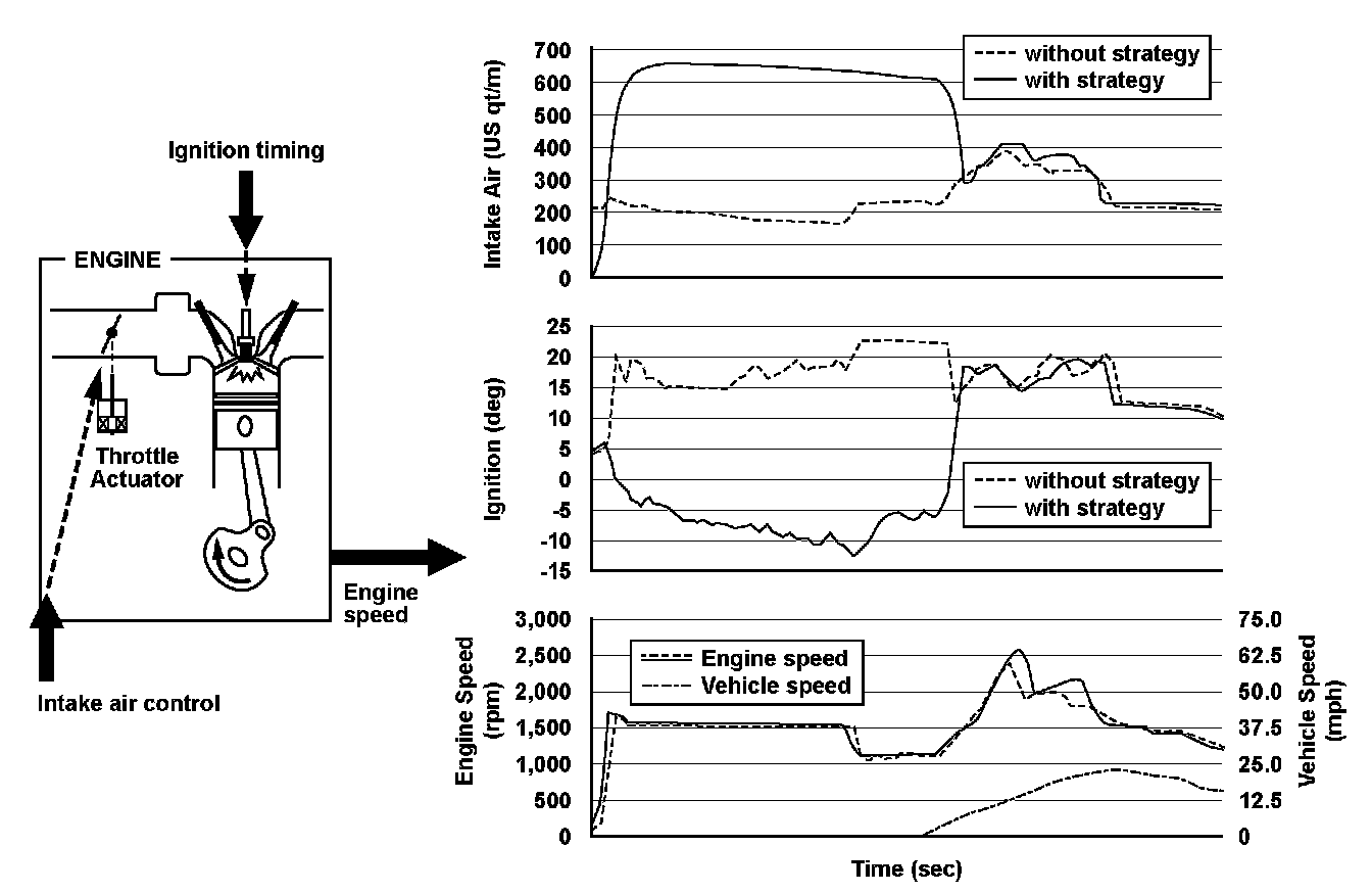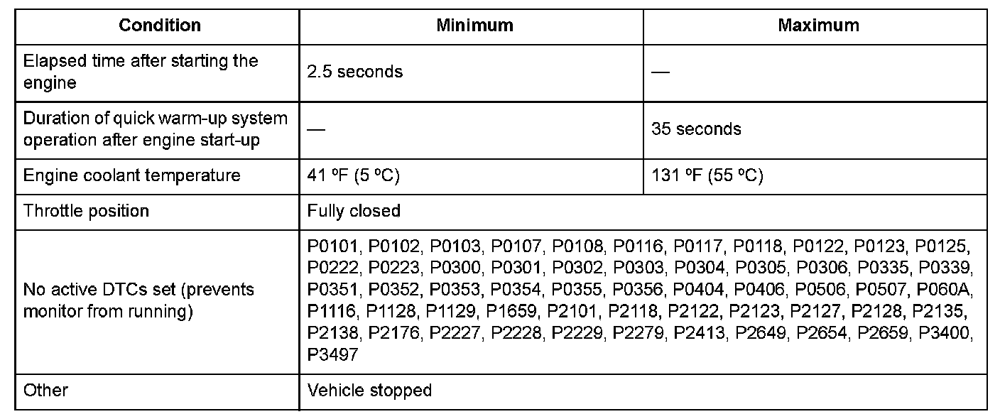 The quick warm-up system supplies additional air and retards the ignition timing when the engine is cold to activate the catalytic converter as quickly as possible. When the actual engine speed is a specified fast idle value, and it continues for a specified time, the powertrain control module (PCM) detects a malfunction and stores a DTC.