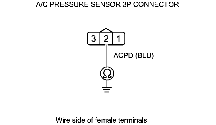 13. Check for continuity between A/C pressure sensor 3P connector terminal No. 2 and body ground.