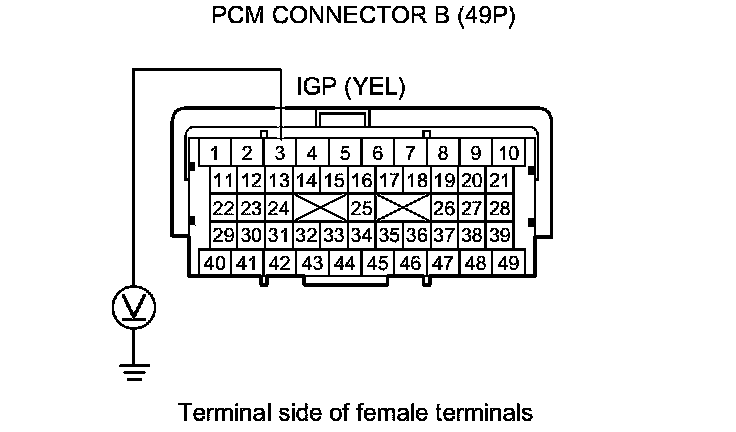 15. Measure the voltage between PCM connector terminal B3 and body ground.