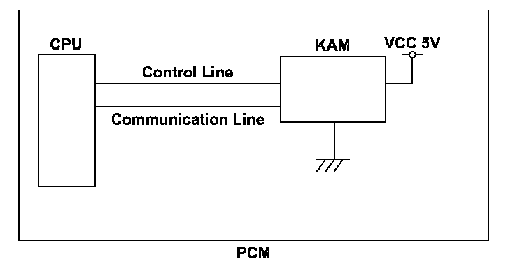 The powertrain control module (PCM) is equipped with a keep alive memory (KAM). The data (control learn data, etc.) for powertrain control and information (vehicle identification number (VIN), etc.) related to the vehicle control is stored in the KAM, so that it can be maintained even when power is not supplied to the PCM, such as when the battery is disconnected. When power is restored to the PCM, the CPU retrieves the stored information from the KAM, but when the data retrieval process is not finished normally, the PCM detects a malfunction and stores a DTC. The CPU writes data to the KAM from the CPU: Control related data is written when the ignition switch is turned to ON (II), and vehicle information when commanded from the HDS. If the data writing process is not completed normally, the PCM detects a malfunction and stores a DTC.