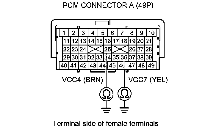 13. Check for continuity between body ground and PCM connector terminals A25, A36, B36, and C11 individually.