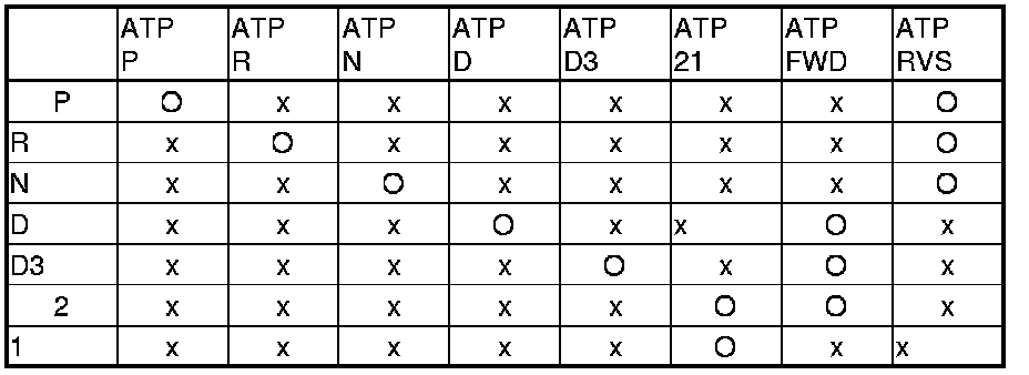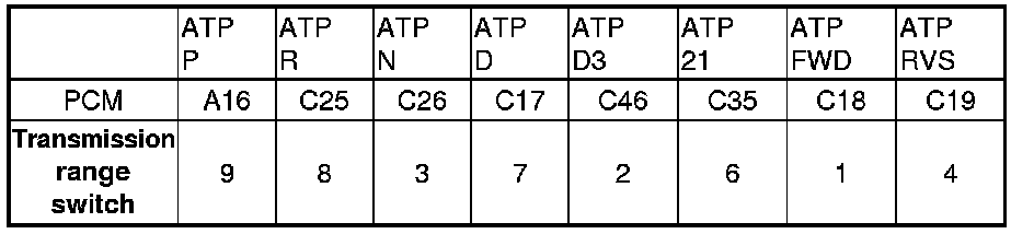2. Compare the ATPP, ATPR, ATPN, ATPD, ATPD3, ATP21, ATPFWD, and ATPRVS inputs with the HDS to the following table, in each shift lever position.