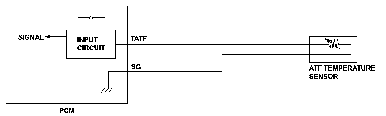 The ATF temperature sensor is a thermistor type sensor that changes resistance according to the change in ATF temperature. The powertrain control module (PCM) sends a 5 V reference voltage to the sensor through a pull-up resistor. When the ATF temperature is low, the sensor resistance increases and the PCM detects a high signal voltage. As the ATF temperature rises, the sensor resistance decreases and the PCM detects a low signal voltage. When the ATF temperature sensor signal voltage to the PCM is under the specification, indicating that the temperature is above the specification (a short to ground), the PCM detects a malfunction and stores a DTC.