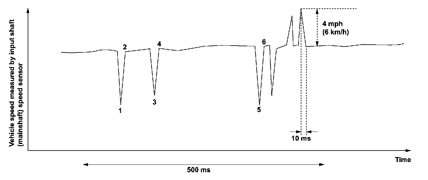 The fluctuation of the vehicle speed measured by the input shaft (mainshaft) speed sensor in 10 milliseconds is 4 mph (6 km/h) or more, and it fluctuates at least six times within 500 milliseconds.